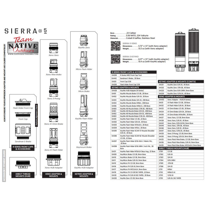 Introducing the all-new 5.56 silencer from Dead Air Silencers. From the beginning, our mission has been to give No Quarter in design, performance, and technology. The Sierra 5 stands true to that mission by giving you everything you want out of a dedicated 5.56 silencer. This is a hard-use silencer. We are not cutting costs or decreasing lifespan by using stainless steel baffles. We are not sacrificing durability in search of saving a few ounces. The Sierra 5 is full-auto rated with no barrel length restrictions. Love or hate the knurling, it’s function over form, directly inline with our goal when developing the Sierra 5. Frankly, if you don’t get the Sierra 5 red hot each time you shoot it we might be offended. Built for professional use, it offers the perfect balance of overall sound and flash suppression while maintaining a compact footprint and minimal weight. By utilizing HUB compatible (1.375-24”) mounting adapters, it can be configured to the end user’s specific needs and is available out of the box with either our KeyMo or Xeno mounting system. Featuring the proven winning combination of welded Cobalt 6 baffles wrapped in a stainless outer tube, Sierra 5 is the last 5.56 suppressor you’ll need.