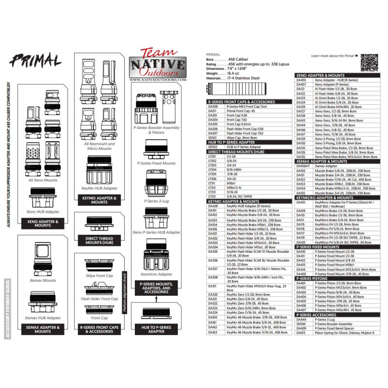 Dead Air outfitted the Primal with maximum adaptability. The suppressor is compatible with the popular HUB (1.375x24) mounting system, allowing you to customize your setup with a variety of mount options, including Key-Mo QD adapters, direct thread mounts, or pistons for handguns. This modularity ensures seamless transitions between firearms, offering ultimate convenience whether you're using semi-auto rifles, bolt-action hunting rigs, or pistol-caliber platforms.
