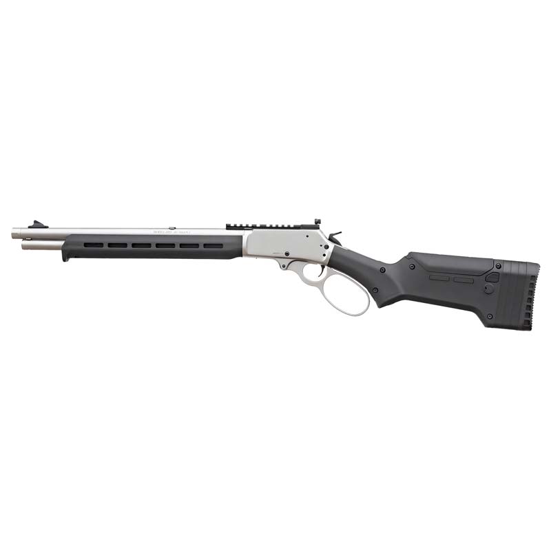 The 1895 Trapper has a Magpul ELG stock and forend capable of mounting a wide variety of accessories and is stable in varying weather conditions. The stock features an ammunition quiver for storage of six additional rounds, three length of pull spacers change the LOP in 1/2" increments, cheek riser and two spacers increase comb height for better sight alignment with optics. Cheek riser adds 1/2" in height and each spacer adds 1/4". The Trapper features a cold hammer-forged, threaded barrel with factory-installed thread protector; stainless steel components have a satin, non-shiny finish and the black hardware gives a distinctive appearance; adjustable Skinner Sights; Picatinny rail; 5rd tubular magazine with a loading gate located on the receiver; positive, push-button, cross-bolt manual safety and traditional half-cock hammer and an oversized lever loop provides clearance for operation with heavy gloves.