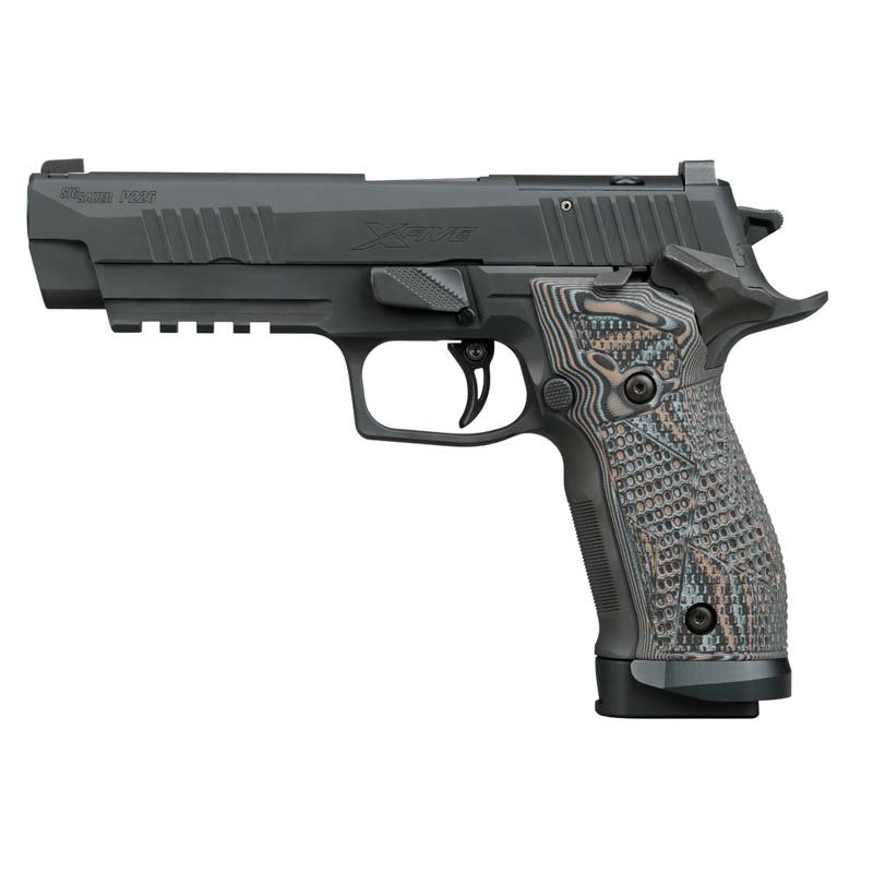 The P226 XFive Extreme features an optic ready slide; bull barrel; fully adjustable AX3 curved skeletonized trigger system; custom Hogue G10 Piranha grip w/alloy magwell; Picatinny rail; improved XSeries extended slide catch; XRAY3 sights. Includes three 20rd steel magazines with alloy base pads. Sig-loc Footprint.