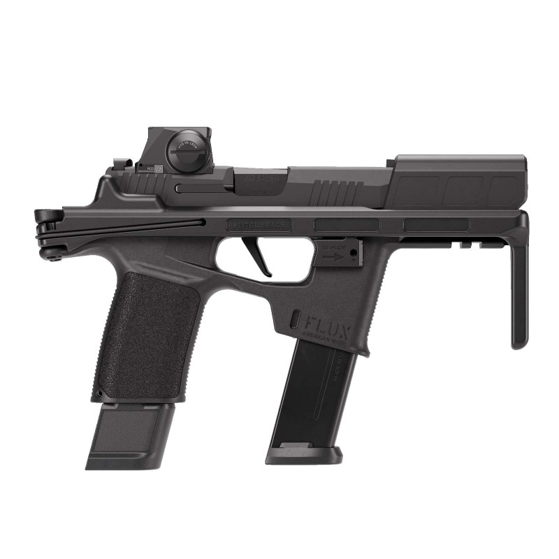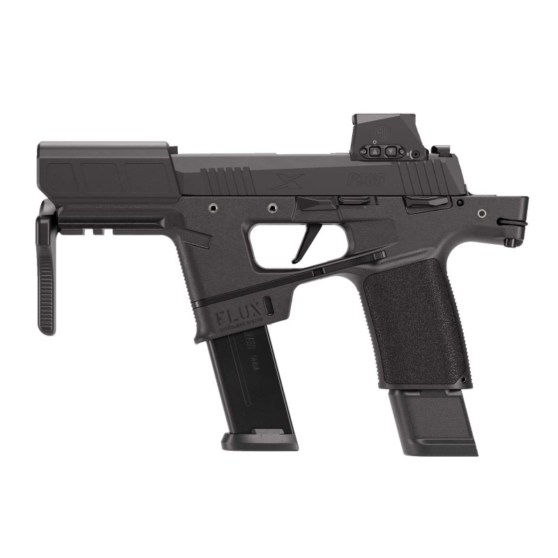 The P365 FLUX meshes a 9mm handgun with a PCC style platform, bringing the speed, maneuverability, and concealability of a pistol, combined with the stability of a carbine. The P365-FLUX delivers a host of innovative features and enhancements, including a spring deployable brace for rapid utilization, muzzle shroud, front picatinny mount for a variety of accessories, XRAY3 Day/Night sights, and ambidextrous controls.